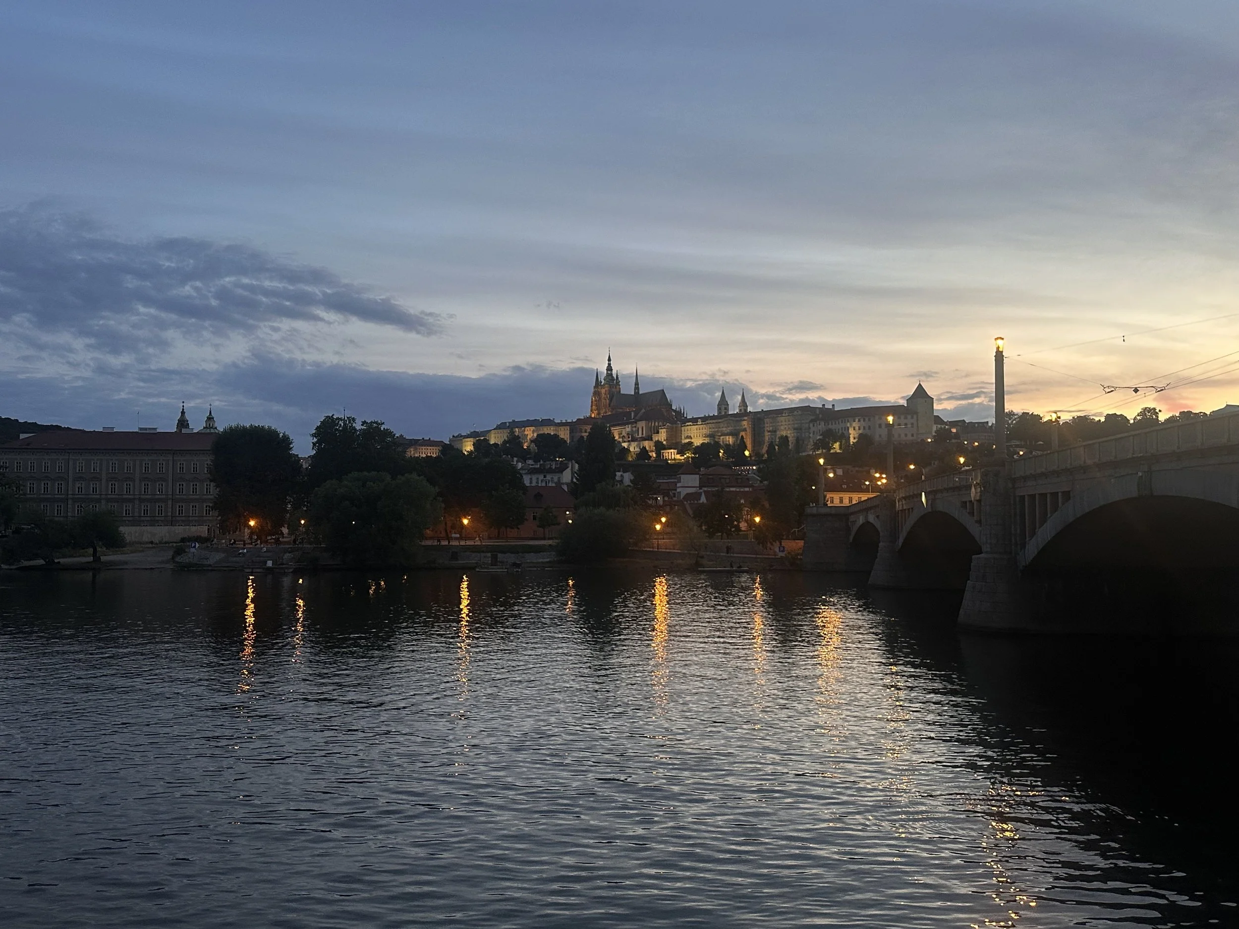 Walked around town and visited some of our favourite places… Frank, of course! Plus Old Town Square, The Globe, etc. Bought three books. Dinner on the water, overlooking the castle.